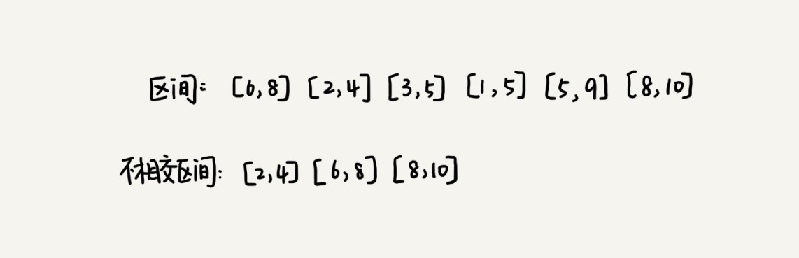 lmin,最右端点是rmax。这个问题就相当于,我们选择几个不相交的区间,从左到右将[lmin, rmax]覆盖上。我们 按照起始端点从小到大的顺序 对这 n 个区间 排序。 - 每次选择的时候,左端点跟前面的已经覆盖的区间不重合的,右端点又尽量小的,这样可以让剩下的未覆盖区间尽可能的大,就可以放置更多的区间。这实际上就是一种贪心的选择方法。